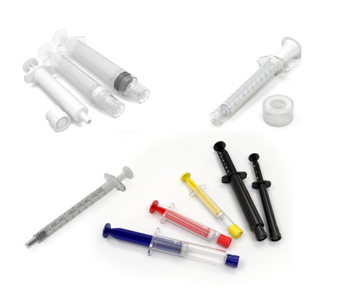 Jeringas dosificadoras, y jeringas cánulas con capacidades desde 10 ml. a 20 ml. con capacidad de impresión a cuatro tintas y personalización.